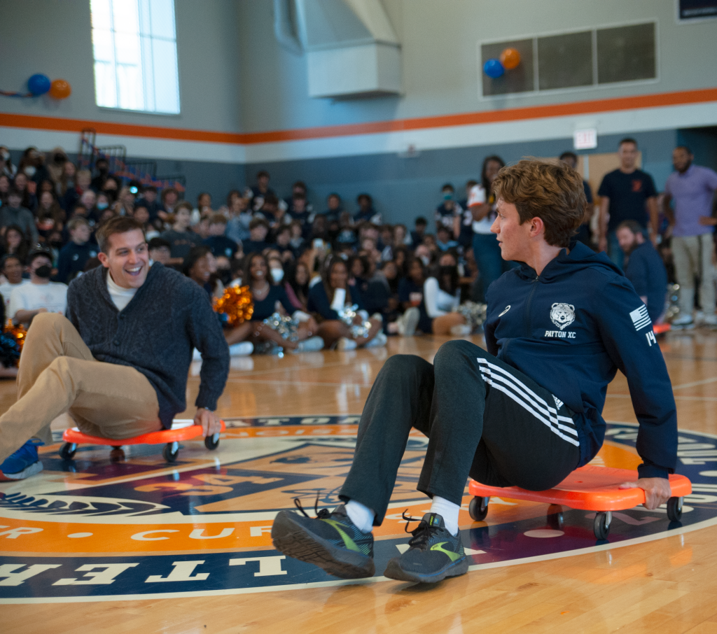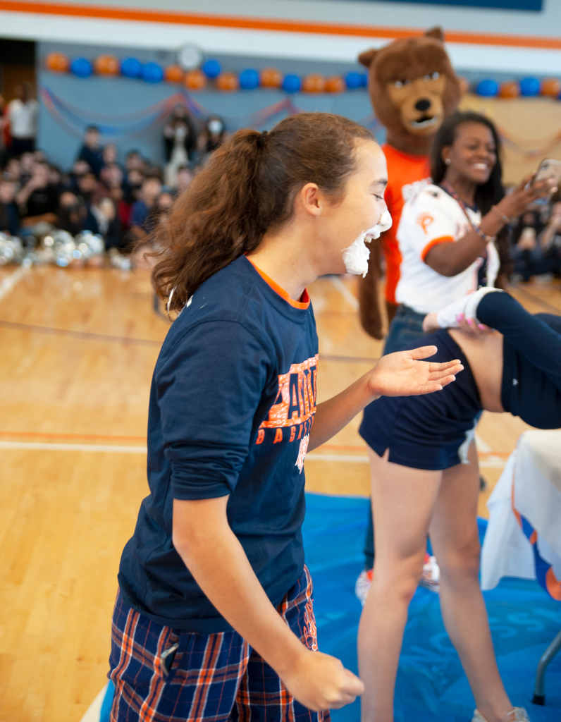 The sense of community and competition present at sports games was brought to the forefront through two contests. In the first, representatives from each grade level attempted to get all the gummy worms out of a whipped cream pie without using their hands, and Ava Manrique ’24 scored a win for the junior class. In the second, the student body came together to compete against faculty and administration in a scooter relay race, with an inter-grade team narrowly defeating the adults.