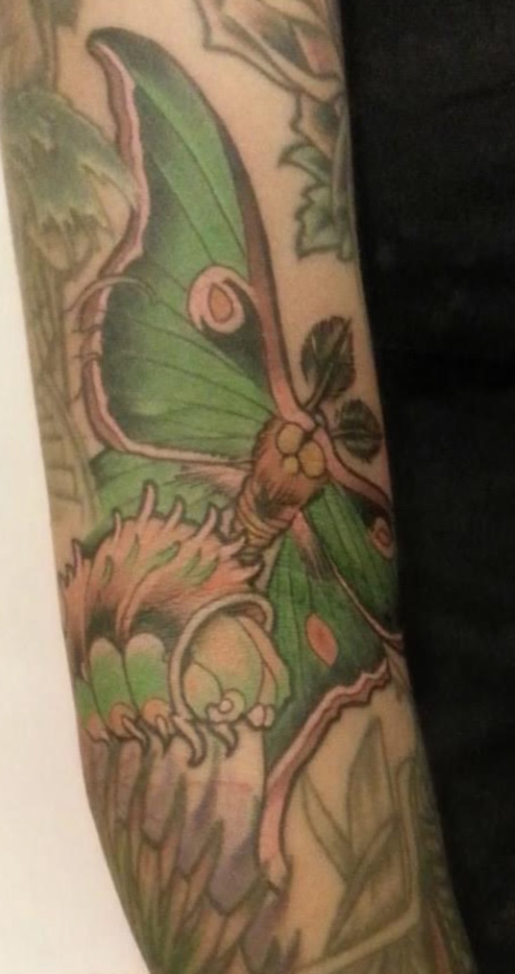 One of them is the first is the Luna Moth on her left elbow. “I got it because one day in my senior year of college, my brother had just died two weeks prior, and I was trying to process the grief while on a field trip around Providence Rhode Island with my class. It was rainy, and the whole city was gray. And then on the pavement, in the middle of the gray, there was a Luna moth at my feet. And I stopped… the thing was huge and vibrant, and beautiful… so that was significant to me.”