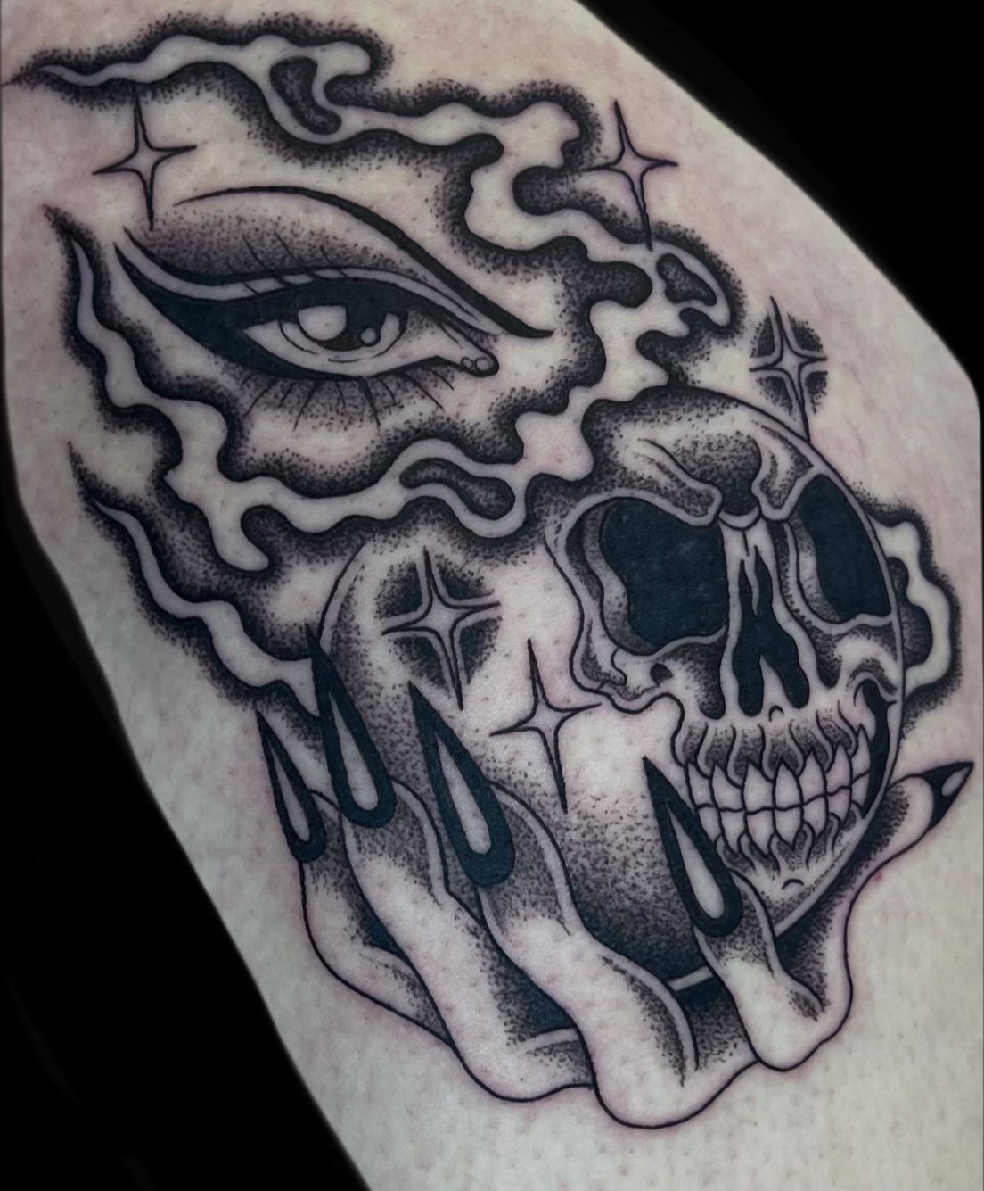 Sometimes, people get tattoos because they like the way they look rather than the story behind them. That is the case for art teacher Mx. Scigousky, whose favorite tattoo is on their leg and is a hand holding a crystal ball with a skull in it with some smoke and an eye. “I got it cause it looks cool,” they said.