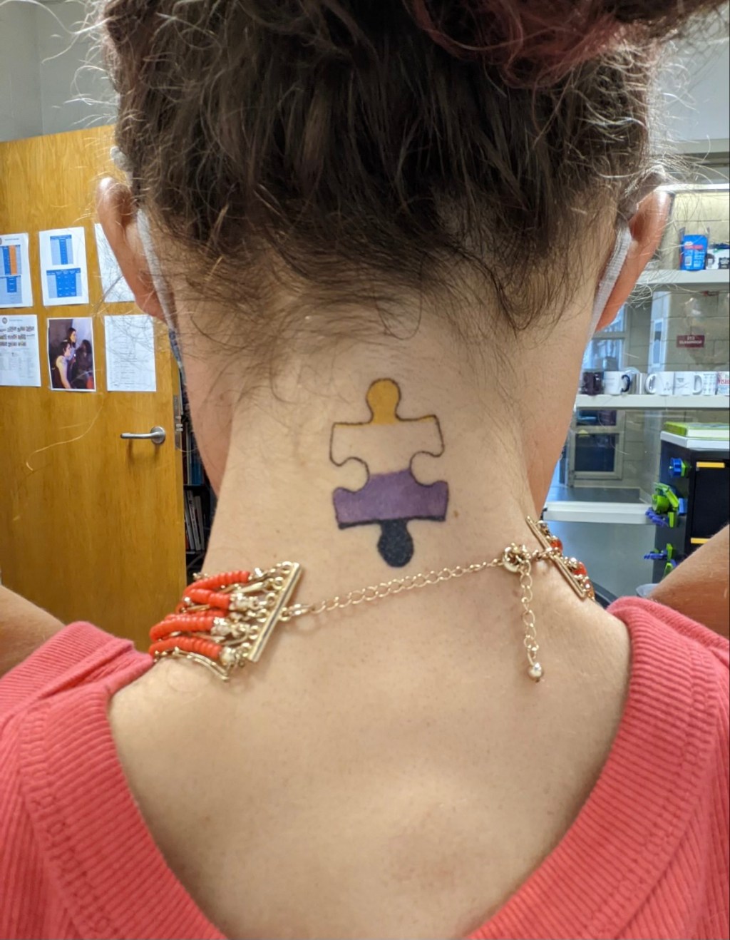 Math and computer science teacher Mx. Lee’s favorite tattoo represents a celebration of a meaningful moment in their life. “I have a puzzle piece tattoo in the color of the non-binary flag on the back of my neck that I got to celebrate my legal name change.” they shared.