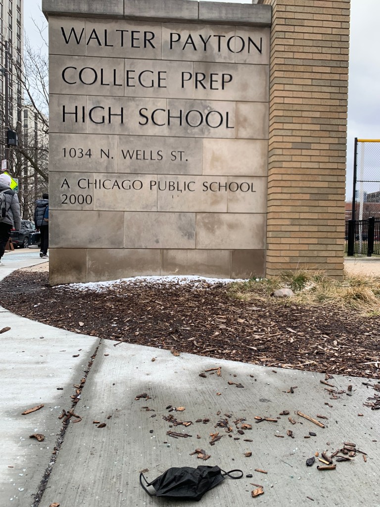 A discarded mask lies on Payton’s sidewalk. Three years after the Covid-19 shutdown, students have since returned to full-time, in-person learning without the requirement of wearing a mask in their school. However, some students still choose to wear masks at Payton, especially if they have been recently sick or if they want want to protect immunocompromised loved ones.