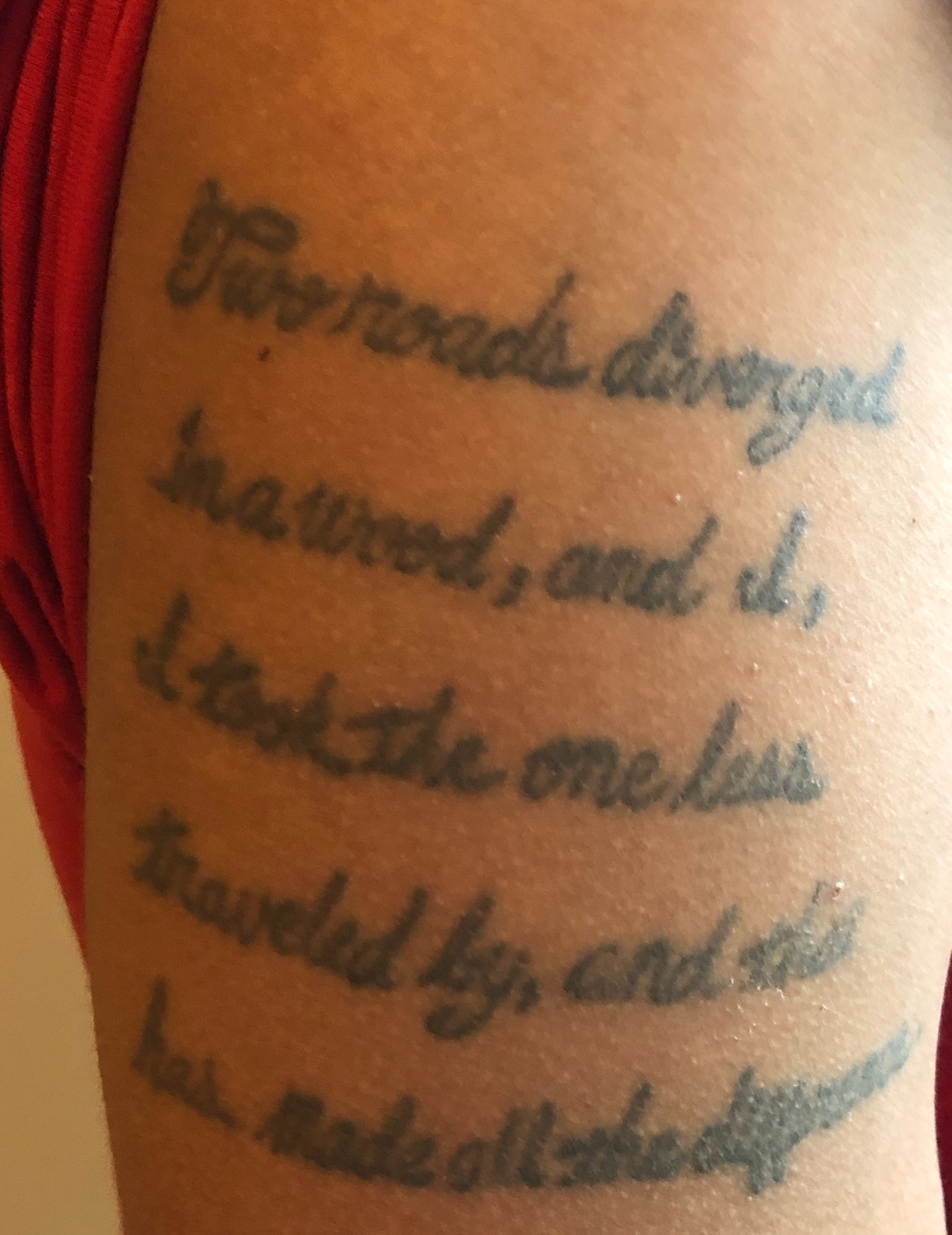 “I have a tattoo of a segment of Robert Frost’s ‘The Road Not Taken,’ and it’s my favorite for a couple of reasons, paraprofessional Mr. Armattoe shared, “The first reason being it acts as a reminder not to be afraid of new or uncommon opportunities, but also because Frost wrote this poem as a joke for a friend who was often indecisive and regretful when it came to choosing a walking path. A joke hidden in something taken so seriously matches my vibe and that’s why I love this tattoo!”