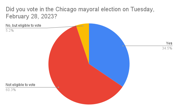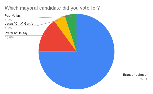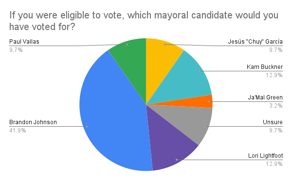 Three-quarters of Paw Print survey respondents who voted chose Brandon Johnson, with the other quarter divided amongst other candidates. However, of those ineligible to vote, only about 40% would have voted for Johnson, with the majority choosing other candidates.
