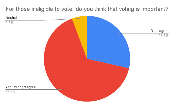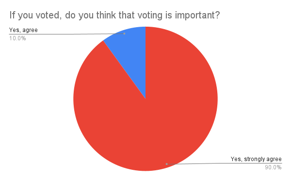 All respondents who voted either agreed or strongly agreed that voting is important, while approximately 94% of respondents who were ineligible to vote agreed or strongly agreed that voting is important.