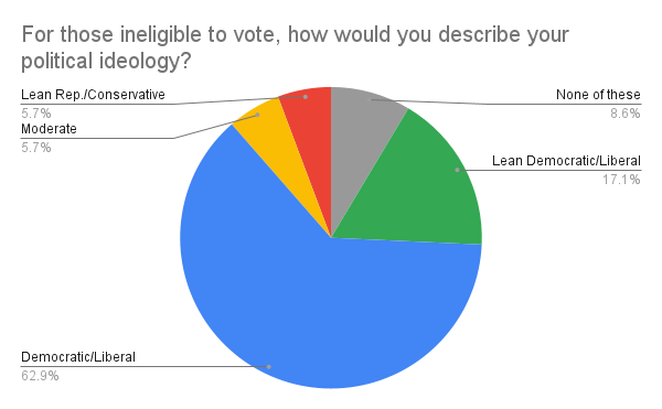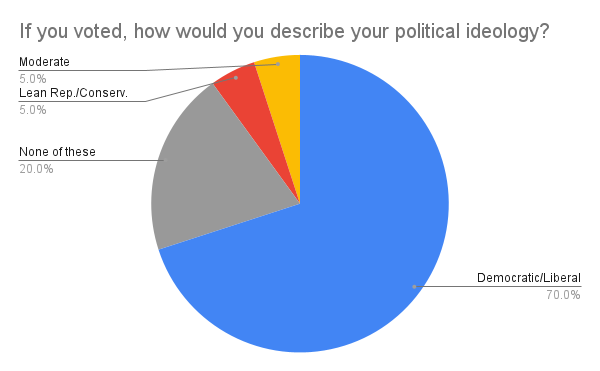 In a survey conducted by the Paw Print, 58 Payton teachers, students, and staff submitted their thoughts on this election as well as voting overall. When asked to describe their political ideologies, 70% of Payton seniors and staff that voted identified as Democrat or liberal, and 5% identified as leaning Republican or conservative. The results of Payton students who were ineligible to vote were similar, with 62.9% of respondents identifying as Democrat or liberal and 5.7% leaning Republican or conservative. For both groups, around 5% identified as moderate. However, voters that responded were much more likely to not identify with any political ideology compared to students ineligible to vote.