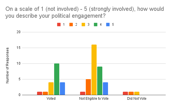 Respondents who voted were more likely to describe themselves as more politically engaged than those who did not vote or were ineligible to vote.
