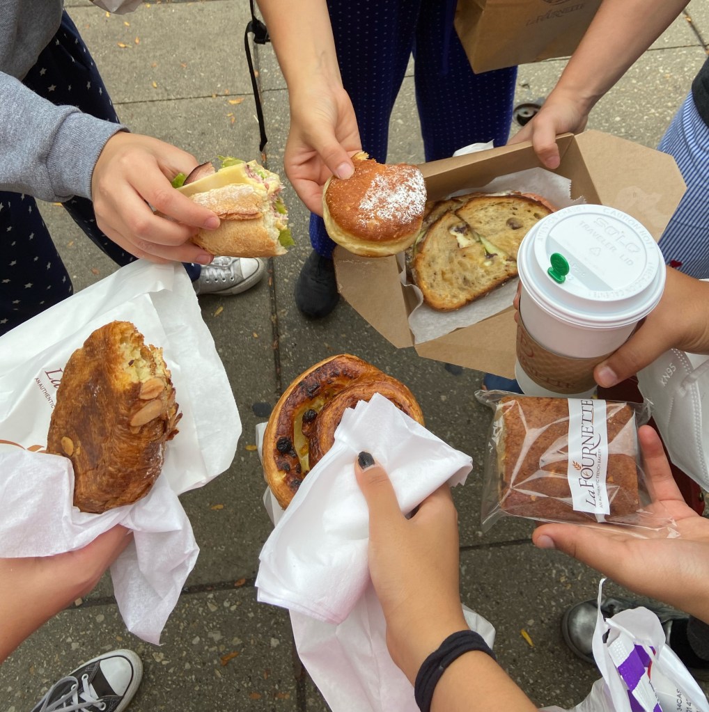 Sophomores enjoy sandwiches and pastries from La Fournette, a French bakery, while on their off campus lunch period during the homecoming spirit week. (Photo courtesy of Bridget Galibois)