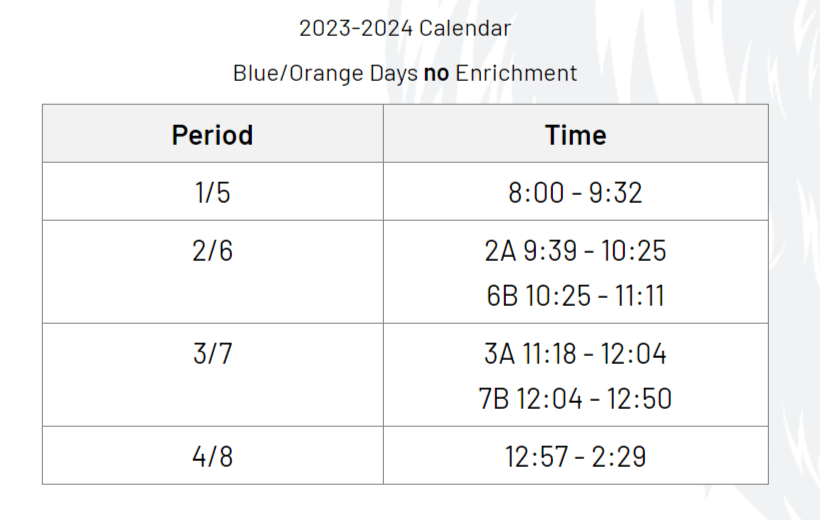 During the 2023-2024 school year, students will no longer attend their advisory for 10 minutes at the beginning of each day; instead, students are expected to go directly to their first class at 8 a.m. sharp. In addition to this, students will no longer have an enrichment period on their non-seminar Wednesdays. Dismissal on these days has been changed to 2:30 p.m.