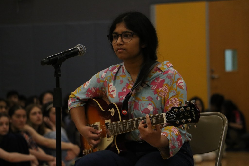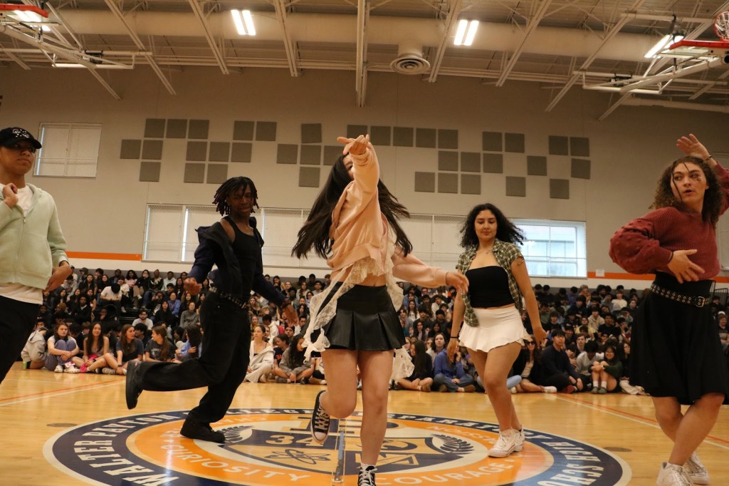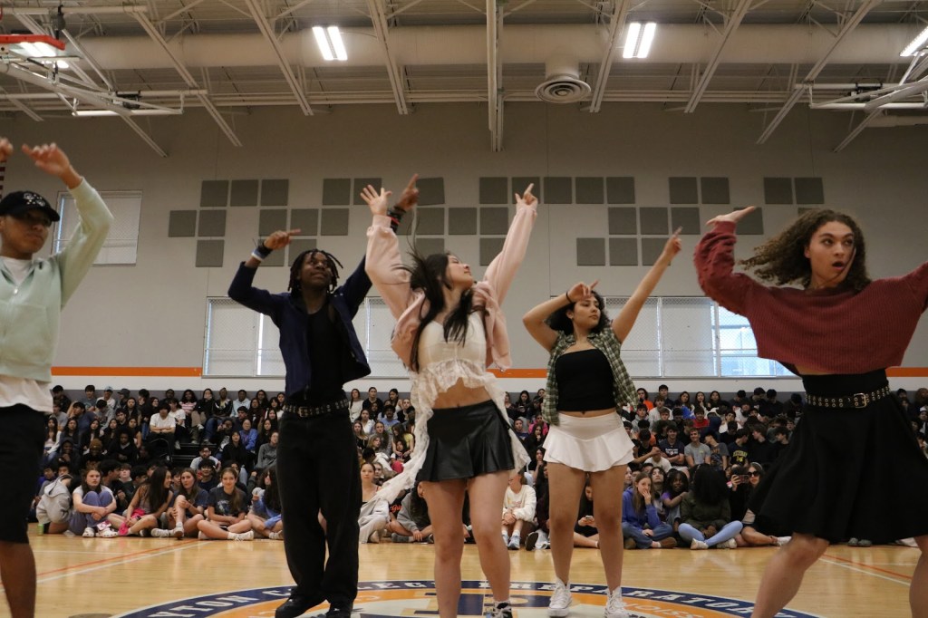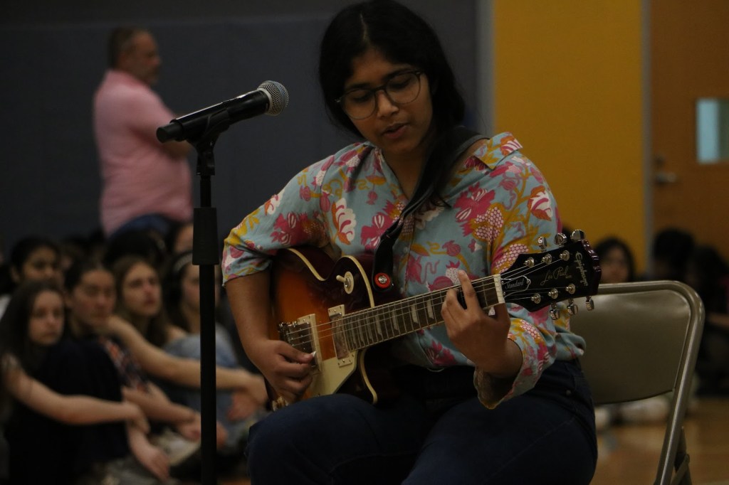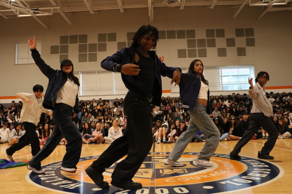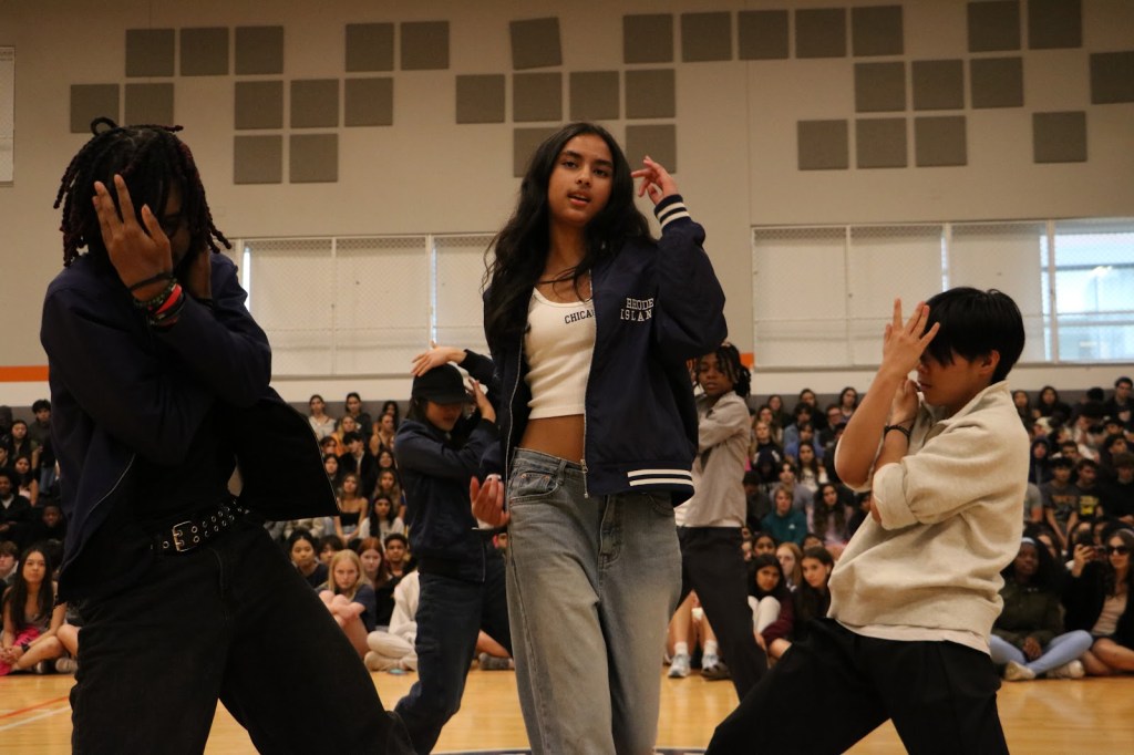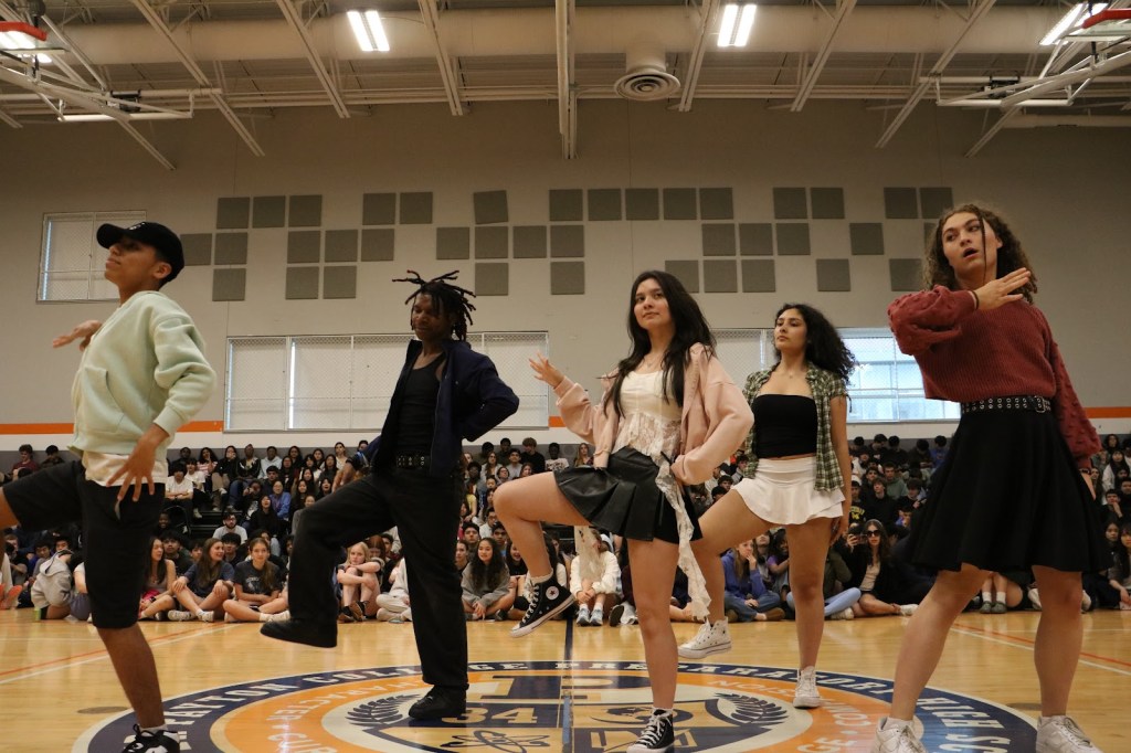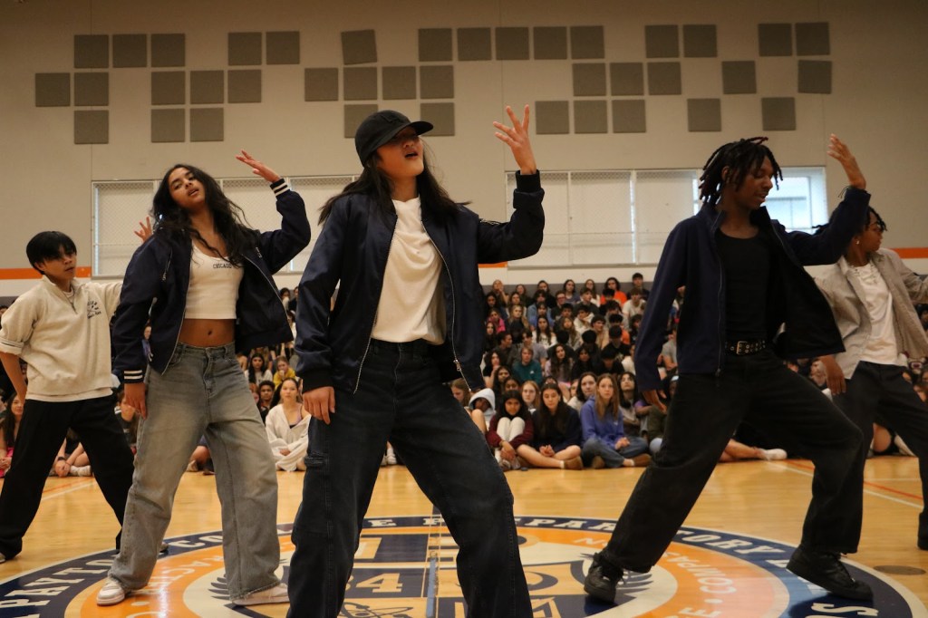 Students Addison and Landon opened the Compass with a performance of Chappell Roan’s “Good Luck, Babe!”Led by Monse, Jakari and Adrien, TAK performed two dance tributes. Following a brief segment on queer accomplishments, such as those of Congresswoman Sarah McBride and singer-songwriter Chappell Roan, Zinnia and Anaya performed “Paprika” by Japanese Breakfast.Bombic Sans member Julian Del Angel performed a spoken word piece. Ivy Lefebvre performed stand up comedy for the second year running. The Compass concluded with a moment of gratitude for Mx. Guizzetti, a Payton visual arts teacher and longtime sponsor of QSA who will be retiring at the end of this school year. Mx. Guizzetti, photographed with Mr. Hoekwater, QSA leaders and Compass performers.
